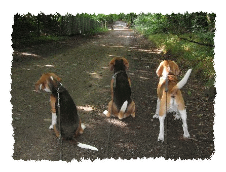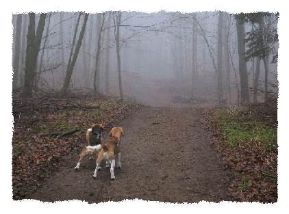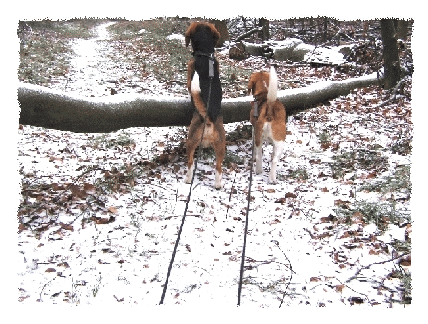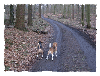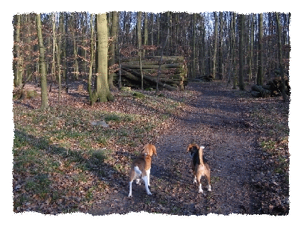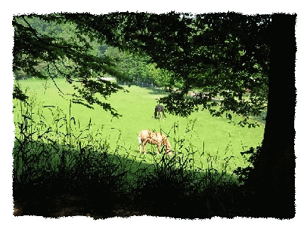 Und hier sind unsere großen Freunde, die Pferde. Die sehen wir jeden Tag. Manchmal sitzt auch ein Zweibeiner oben drauf. Gut, daß wir so klein sind, sonst würden die das bei uns auch noch machen. Was ja bei den Pferden richtig schön ist, daß sie auf unserem Weg immer ihre Äpfel verlieren. Wenn die noch warm sind, sind sie so richtig lecker. Aber Herrchen schimpft immer und ruft dann: “Pfui, Pfui”. Das können wir überhaupt nicht verstehen.